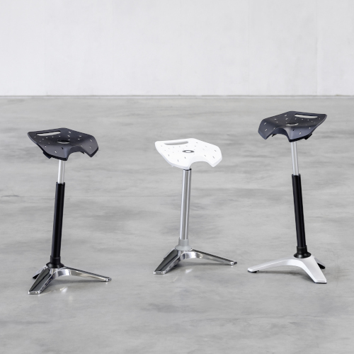 Beim Ongo Stand ist der dreiarmigen Standfuß elastisch gelagert, wodurch sich die Neigung und Position des Sitzes optimal an die Arbeitsbedingungen anpassen kann. Durch diese Beweglichkeit erhöht sich auch der allgemeine Aktionsradius. Die Gasfeder ist auf Sitzhöhe 61 – 90 cm einstellbar.